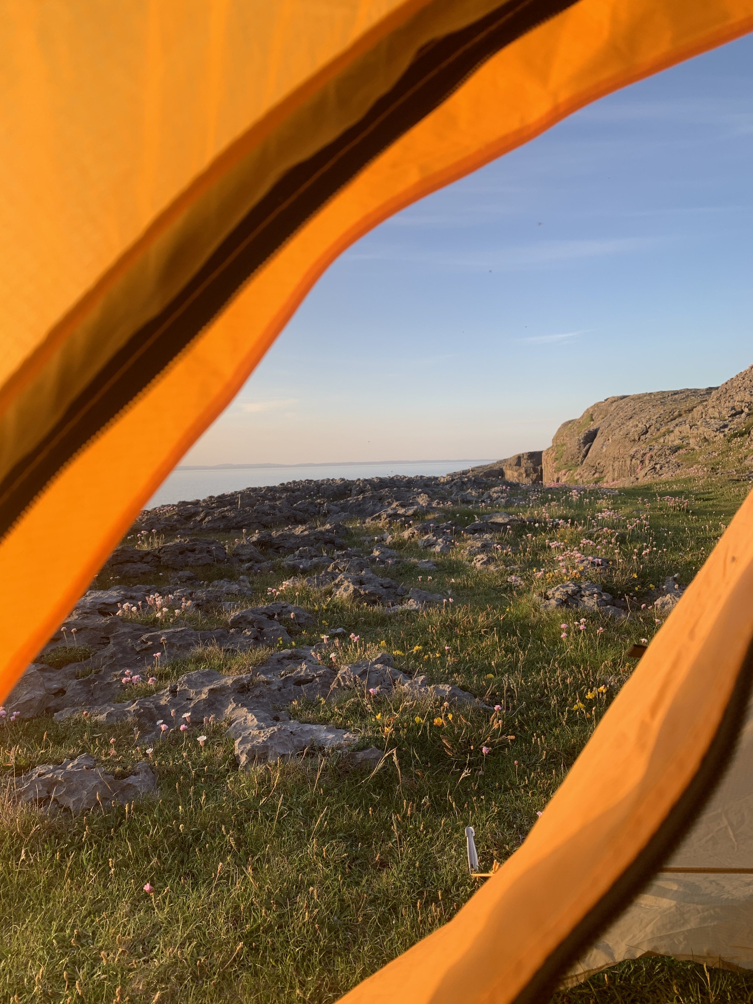 Pitching our tent on the top of the crag, we lived out of the car and climbed to our hearts’ content. “Why is the grass so lush and green?” Christelle asked. “Because it’s normally raining!” I replied. The approach is so short you can use a shopping bag to carry your gear. The Burren’s smooth, vertical walls are dramatic, cut by a knife and sculpted with sidepulls. The limestone is bullet, and the sea licks at the boulders with their bald heads poking out of the water. I like the clean-cut nature of the crag: you’re either climbing, or you’re sat on the grass at the top, leaning over, the updraft in your hair. The cracks bite, but they also eat up good gear. The Aran Islands, squatting just offshore, act as the weather forecast. The passing of time is marked by the sighing of the sea as it rises and falls throughout the day.