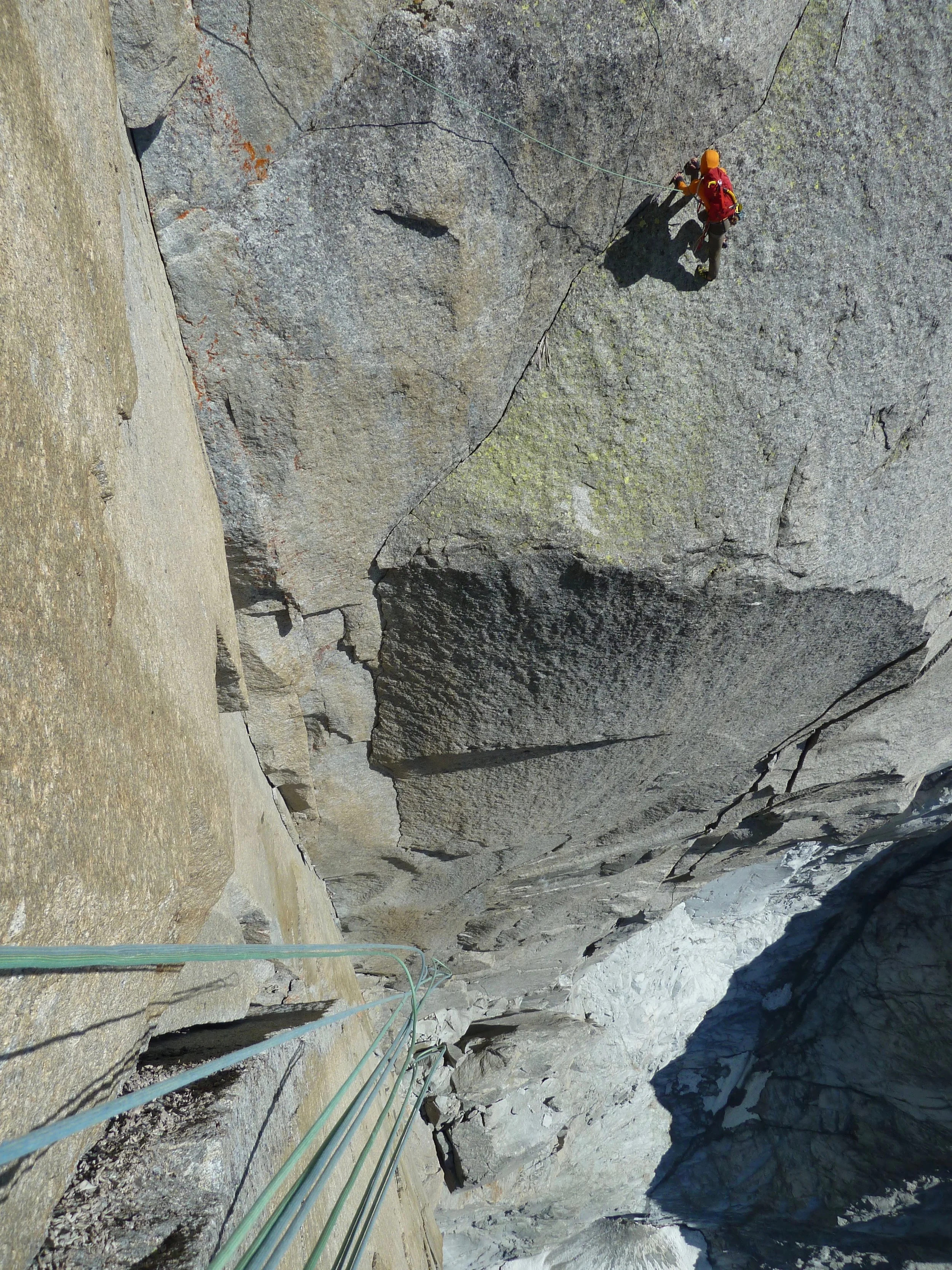 What followed was a typical rappel down a 800m face, at night, over loose and slabby granite. Of course we lost the bolted belays, spinning over cliff-bands. Of course we resorted to using booming anchors and hollow spikes. The hours dragged, our minds slowed and a numb, dull brain-fog returned.